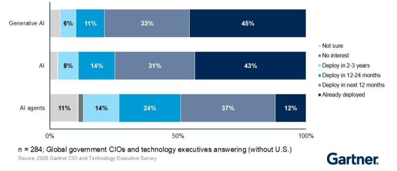 According to the survey, 74% of government CIOs (not including the U.S.) have already deployed or plan to deploy AI within the next 12 months, with GenAI higher at 78%. Interest in AI agents is also rising, with 49% reporting current or planned deployment in the next 12 months (see Figure 1).